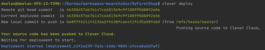 Ne pas oublier de commit les modifications pour pouvoir push l’application sur Clever Cloud. Maintenant que tout est prêt, il faut push l’application depuis Clever directement. Pour cela, dans le terminal, il faut lancer la commande clever deploy. Ensuite, si vous avez créé votre application via la Console Clever, il vous faut lier votre application en local à l’aide de clever link <app_id> avec <app_id> ayant pour valeur l’id de votre application, renseigné dans Information > Application information.