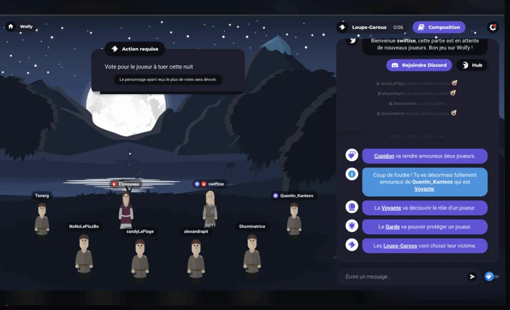 Pas de pleine lune sans Loup-Garou ! Chacun sous son plaid avec un chocolat chaud ou son dîner. Connectés sur le site Wolfy pour une soirée pleine de trahisons numériques et de débats intenses sur “qui est le loup garou ?”, “qui sera le maire” ou encore “qui est cupidon ? on a des comptes à régler…”.🐺